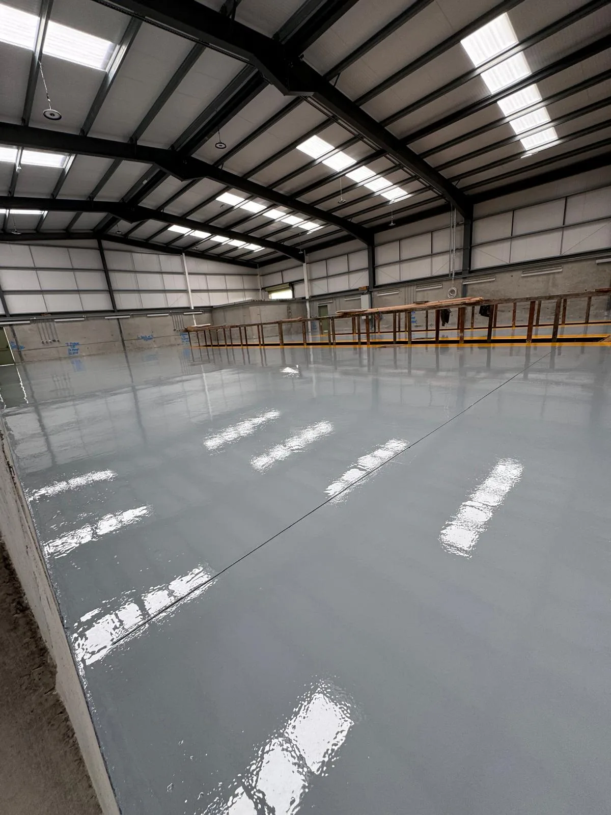 AQL carried out a restoration and protection measures, including:Surface Preparation: The entire floor area was vacuum blasted to remove any dirt or grime and to prepare a suitable bonding surface for the application. A deep clean then took place to get rid of any debris from blasting and to remove any dust from the area.DPM Primer Coat- A DPM primer coat was then applied to stop any moisture penetrating through the floor, allow for optimal bonding and to seal the floor from air bubbles that may be present within the concrete.Epoxy Filler- Epoxy filler was used to remove any blemishes or imperfections within the floorBuff Sanding- Buff sanding and cleaning was completed between each coat to remove any imperfections and to increase bonding.Application of Topcoats- The topcoats of resin were then applied in the clients specified colour to give a sleek, aesthetically pleasing result. Highlighted Areas- Coats of yellow were then applied around the lift pits for operational and safety purposes.