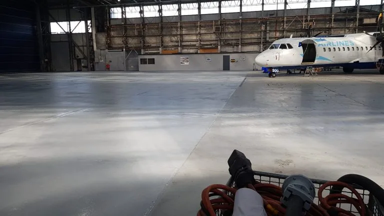 Industrial floor grinding machines with hoses attached are positioned in a dimly lit underground parking garage with several parked cars in the background.